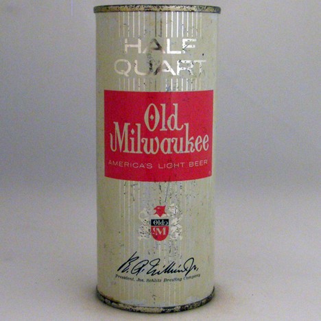 This vintage Old Milwaukee Light Beer can from Jos. Schlitz Brewing Co. in Milwaukee, Wisconsin is dated 1962, 'Half Quart', and unopened; the bottom and top are embossed with 'Super Softop'.