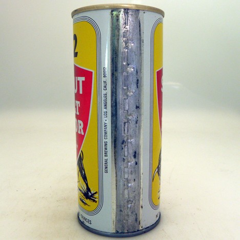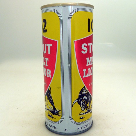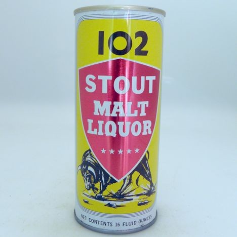 This vintage 102 Stout Malt Liquor beer can from the General Brewing Co. in Los Angeles, California showing the bull on the front is a 16 ounce self-opening beer can with an American ring pull top and is bottom opened.