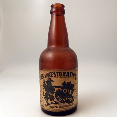 This vintage O & L Malt Tonic beer bottle from Obermeyer & Liebmann Inc. in Brooklyn, New York, 'King of Restoratives', shows the directions: 'Use from one half to a full bottle during each meal and before retiring'. It is embossed with the OL trademark on the back and 'Registered' on the bottom back side.